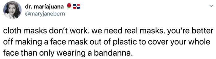 Dr。 maríajuana指出,布口罩并不管用,我们需要真正的口罩。你最好能够用塑料做一个口罩,这样就能盖住整张脸了。