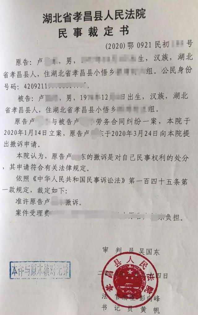 原告卢某东与被告卢某华都是孝昌县小悟乡桥湾村人,两人之间存在劳务关系。2020年1月,因多次向卢某华催讨劳务费未果,卢某东为维护自身合法权益,向法院提起诉讼。1月14日孝昌法院立案,鉴于疫情防控形势严峻,经与双方当事人沟通,该案延期审理。