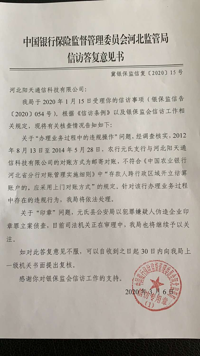 新京报讯(记者 李大伟)4月9日,新京报记者于河北阳天通信科技有限公司(下简称“阳天通信”)实际控制人王向阳(化名)处独家获悉,针对新京报此前报道的“消失的4500万银行存款”一事,其于三月中旬收到中国银行保险监督管理委员会河北监管局信访答复意见书(下称“意见书”)。该意见书显示:“农行元氏支行在办理业务过程中存在违规行为。对于该行办理业务过程中存在的违规行为,我局将依法处理。”