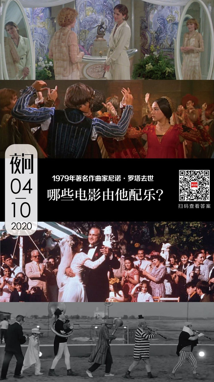 答案:四幅剧照的电影他都参与了配乐。从上至下分别是《尼罗河上的惨案》(1978)、《罗密欧与朱丽叶》(1968)、《教父》(1972)、《八部半》(1963)。