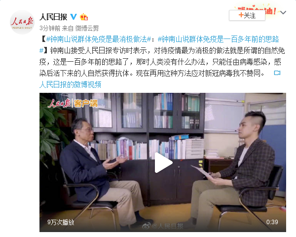 钟南山接受人民日报专访时表示,对待疫情最为消极的做法就是所谓的自然免疫,这是一百多年前的思路了,那时人类没有什么办法,只能任由病毒感染,感染后活下来的人自然获得抗体。现在再用这种方法应对新冠病毒我不赞同。