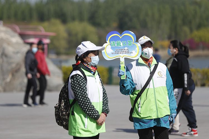 北京绿色志愿者在公园内,提醒市民戴好口罩。