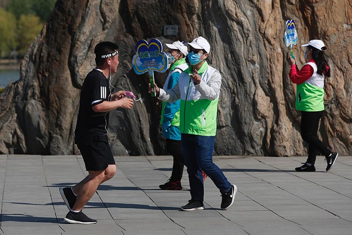 北京绿色志愿者提醒公园内健身的市民戴口罩。