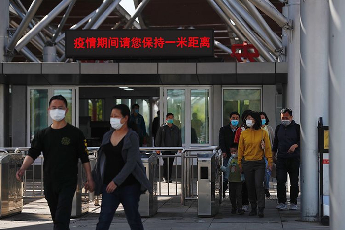 北京绿色志愿者提醒公园内的市民戴上口罩。