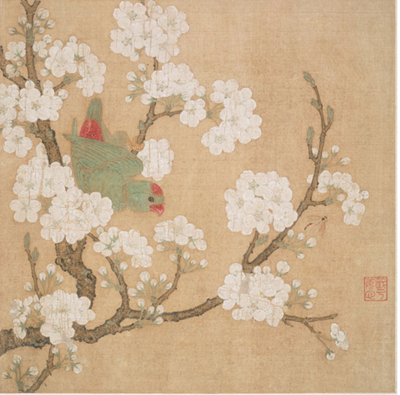 宋代流传下来比较著名的梨花图当属《梨花鹦鹉图》,作者不详。画中梨花满枝,花间一只羽毛艳丽的鹦鹉,探头探脑,似欲觅食。画面生动有趣,雪白的梨花和艳丽的鹦鹉形成鲜明对比,显示了宋人高超的绘画技巧。