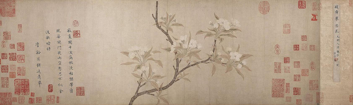 花鸟大家钱选的《梨花图卷》是他折枝花卉作品的代表作。梨花设色淡雅,自然生动,无论花叶的轮廓还是叶脉,都描绘得非常精细。画后有作者自题诗一首:“寂寞阑干泪满枝,洗妆犹带旧风姿。闭门夜雨空愁思,不似金波欲暗时。”这幅作品,诗与画相得益彰,充分表现了梨花的文化内涵。