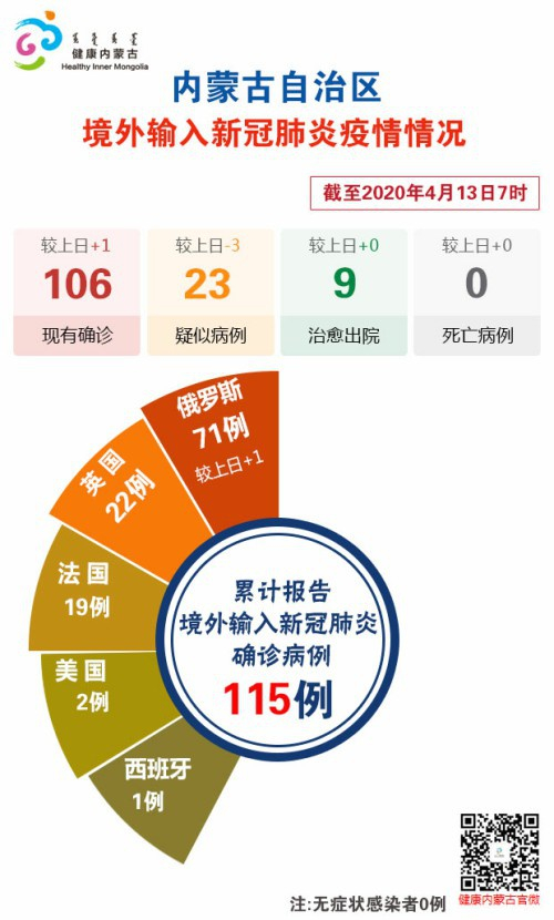 截至2020年4月13日7时,内蒙古自治区累计报告境外输入新冠肺炎确诊病例115例、治愈出院病例9例。现有境外输入确诊病例106例、疑似病例23例。115例境外输入新冠肺炎确诊病例中,71例来自俄罗斯、22例来自英国、19例来自法国、2例来自美国、1例来自西班牙。