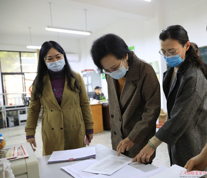 南宁市纪委监委督促指导全市中小学校打好脱贫攻坚的“义务教育有保障”战役,监督教育精准扶贫政策落到实处,确保建档立卡贫困户学生“应助尽助”,资助对象不错、不漏。图为南宁市纪委副书记、市监委副主任姜剑虹在学校查看贫困学子返校复课名单。