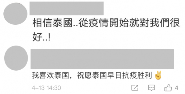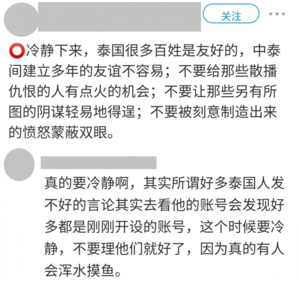 小锐注意到,此次风波经历了短暂的发酵后,一些此前情绪激动的中国网友也已经冷静了下来。到今天(13日)中午,在泰国国家旅游局的官方微博评论区,已经有不少留言呼吁大家理性看待风波,并为泰国“抗疫”加油打气: