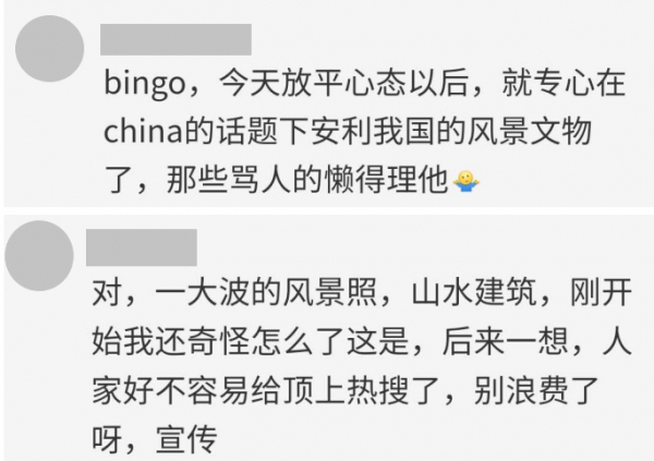 有网友也改变了“斗争策略”,选择在“中国”话题下发布中国的美景、美食、建筑、文化等内容,展示中国之美。