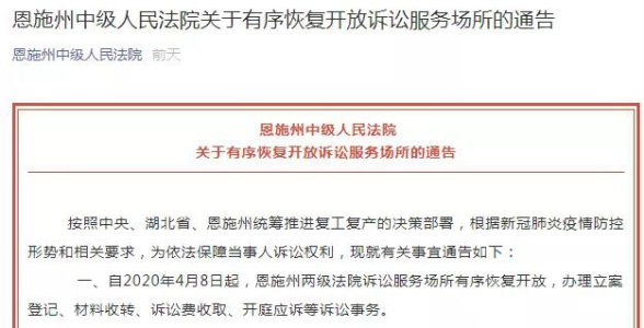 经过前期扎实的准备工作,4月7日,恩施州中院在官方微信公众号上发布了《关于有序恢复开放诉讼服务场所的通告》。