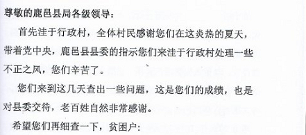 “洼于村民首先感谢工作组驻村查处我们身边的不正之风,希望你们细查下俺村的低保问题:洼于村干部权力大,叫谁吃低保谁就能吃上,开着车、开着超市、住着楼也能吃,不让谁吃谁别想,生活再困难也不行……”