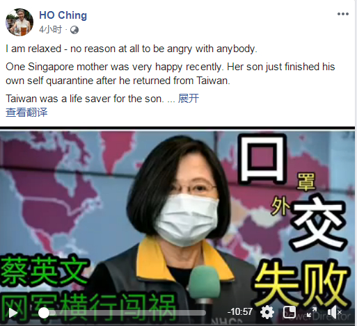 新加坡总理夫人转视频:蔡英文网军横行 口罩“外交”失败