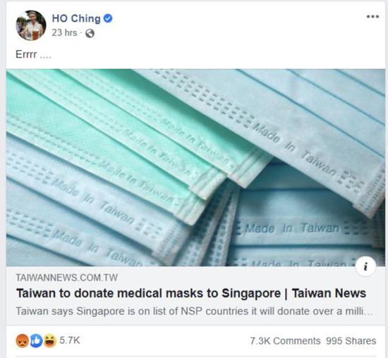 [海外网4月15日|战疫全时区]日前民进党当局要捐口罩给新加坡,新加坡总理夫人何晶在社交媒体上以一个“呃……”字转发新闻报道,引起台湾绿营网军不满,并对其展开围攻。15日,事情又有了新进展,何晶转发了一条揭露“蔡英文网军横行闯祸”的视频,再度引发舆论风暴。