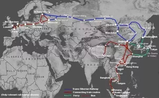 俄罗斯现在拥有一条东西向串联欧亚领土的铁路,即1890年代开建的西伯利亚大铁路。西伯利亚大铁路西起彼得堡,东到海参崴,全长9000多公里,迄今为止都是全世界最长的铁路。