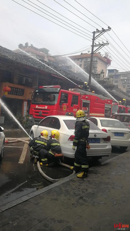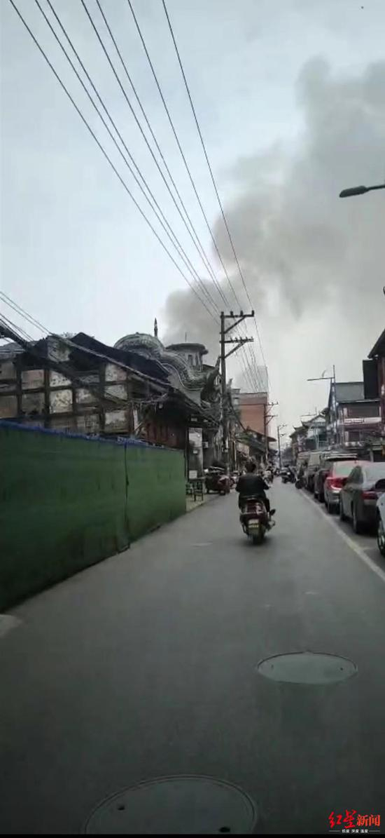 从网友在附近高楼拍摄的视频来看,起火院落为老旧建筑,多为木质结构民房,房顶都是青瓦。现场浓烟滚滚,消防水柱喷向着火点。由于走马街属于宜宾地区老街,着火院落消防车无法通行,只能在外面隔着一栋老旧建筑往里喷水。
