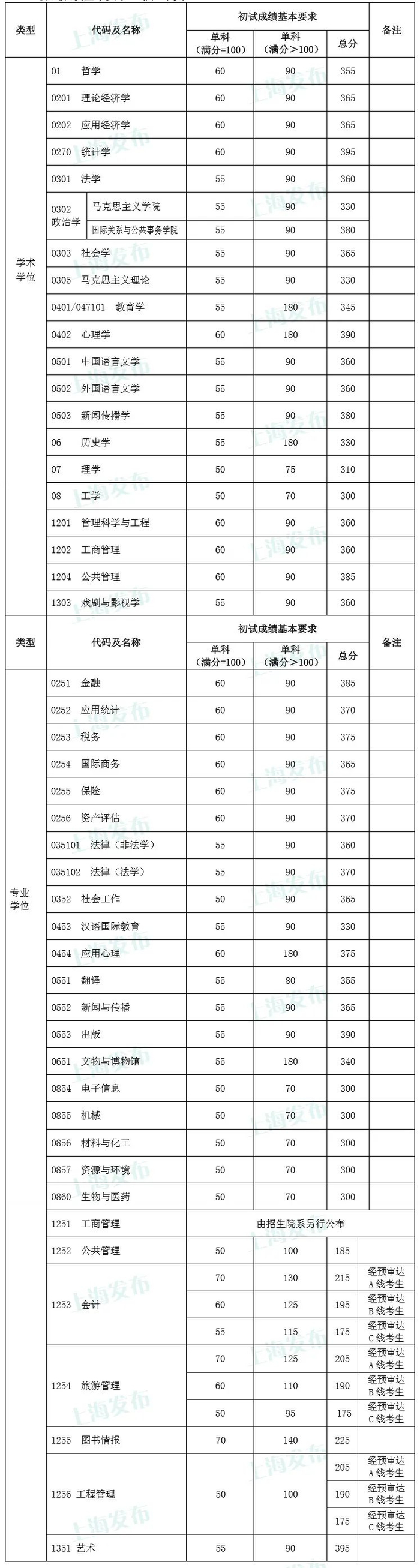 复旦大学2020 年硕士研究生招生考试考生进入复试的初试成绩基本要求和有关说明公布如下: