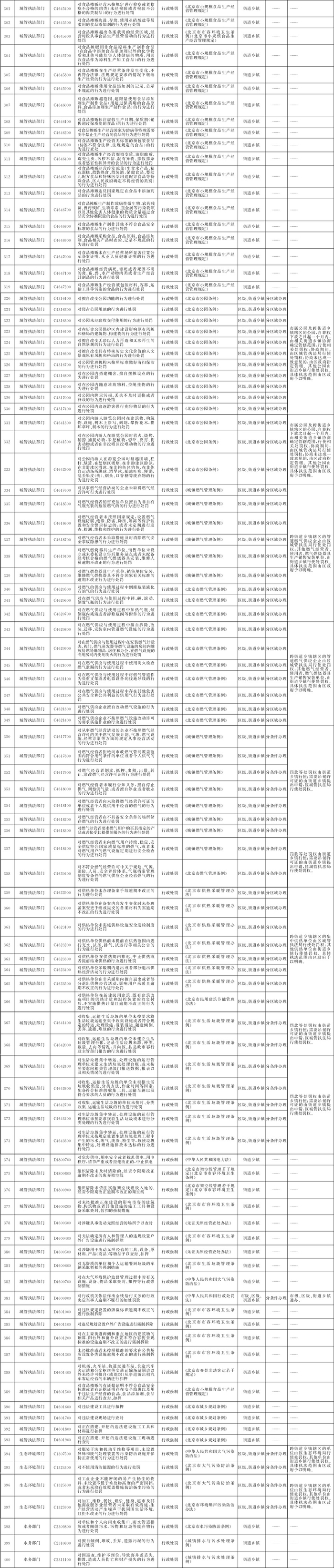 (二)原由城管执法部门行使的市容环境卫生管理、公用事业管理、能源运行管理等方面的部分行政处罚权、行政强制权。石油天然气管道保护的行政检查权由城管执法部门和街道办事处、乡镇人民政府共同行使,行政处罚权仍由城管执法部门行使。