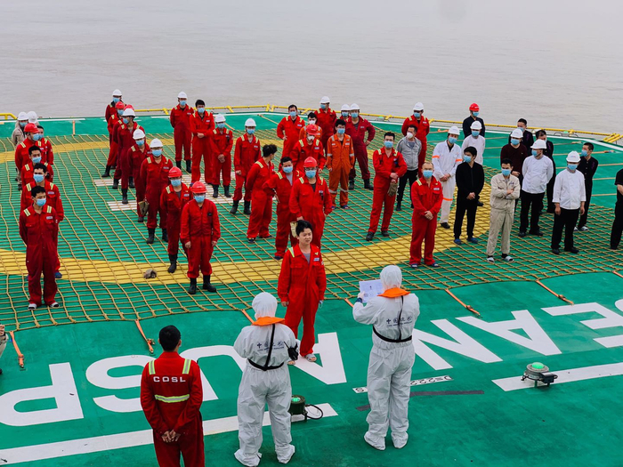 据洋山边检站介绍,本次登上石油钻井平台的68名工作人员均为中国籍员工,在登平台前,所属公司均已安排14天居家隔离,并向边检机关报备了绿色健康码。在平台换旗交付前,洋山边检站通过“预约办”与厂方、代理方根据疫情、天气、人员情况,约定平台换旗出港时间,提前安排警力保障换旗出港流程无缝衔接。同时,通过无纸化申报,指导代理人员通过“国家移民管理局边检行政许可网上窗口”为68名工作人员办理登轮证件,一次性办结平台换旗和出港边检手续,合并工作环节,尽可能减少人员接触。