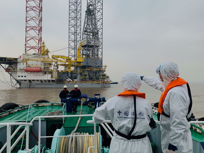 由于该石油钻井平台换旗后变更为巴拿马国籍,登记为国际航行船舶。洋山边检站按照4月14日上海颁布的境外来沪船舶在港期间岸基登轮作业人员健康管理要求,加强与口岸各单位的密切配合,协同落实防护措施,强化现场人员管理,将疫情防控措施前置于平台交付各环节。