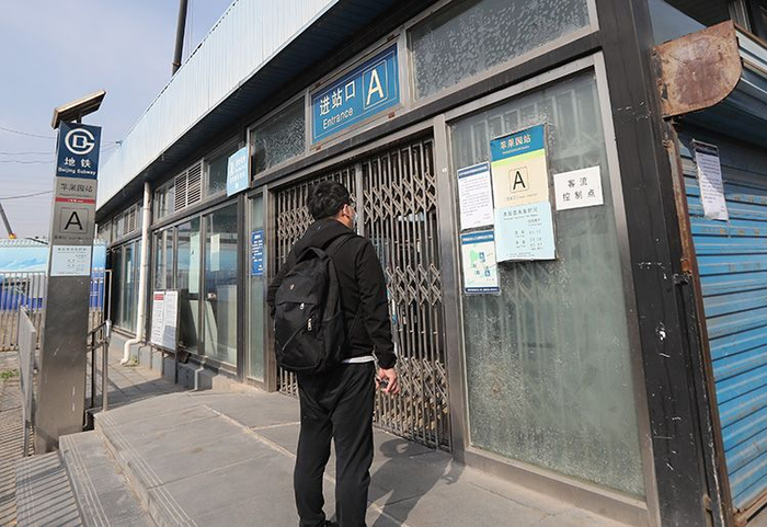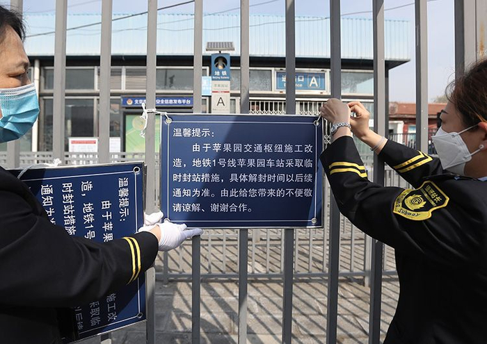 地铁工作人员在苹果园站外悬挂封站改造提示。