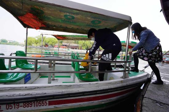 今天上午8时许,玉渊潭公园樱花园码头上,几名工作人员已经忙碌起来,今天这个码头的首批40条电动游船将正式下水。只见工作人员一手喷着消毒液,一手拿布,弯着腰蹲在船边擦拭着游客可能触及到的座椅、船栏、方向盘、救生圈等区域。“每艘船回来之后,我们都会进行一次消毒,让游客放心乘坐。”码头外,售票处的室外工作台已经摆好,桌上摆着打印好的购票乘船流程、北京健康宝二维码和一本游客信息登记本。