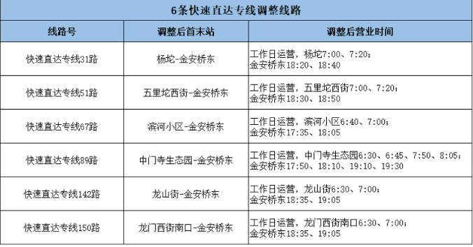 途经地铁苹果园站的6条快速直达专线,由地铁苹果园站缩短至金安桥东站上下客,调整后的运营时间见下表。