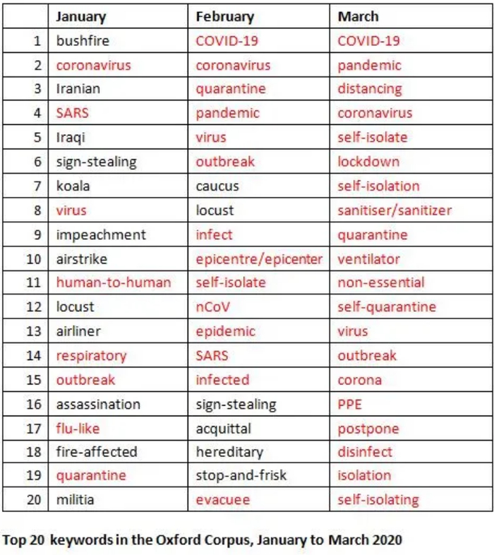2020年1-3月占据牛津语料库前20名的关键词。