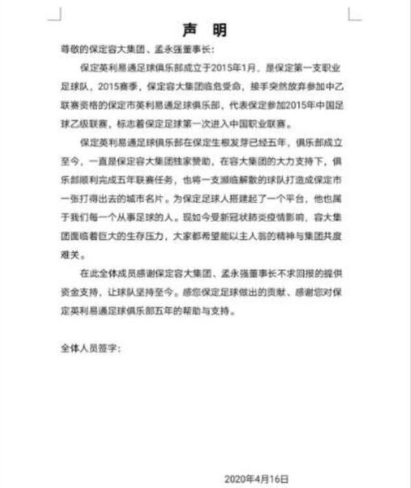 这份声明写道:“在此全体球员感谢保定容大集团、孟永强董事长不求回报的资金支持,让球队坚持至今。感谢您对保定足球做出的贡献,感谢您对保定英利易通足球俱乐部五年的帮助与支持。”