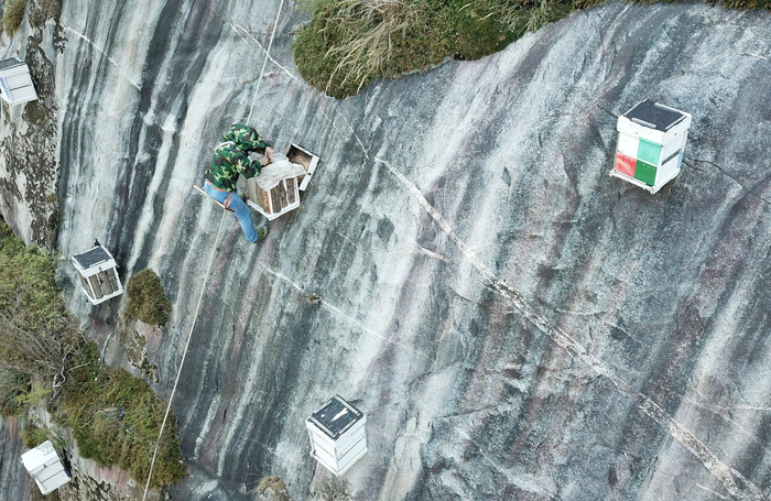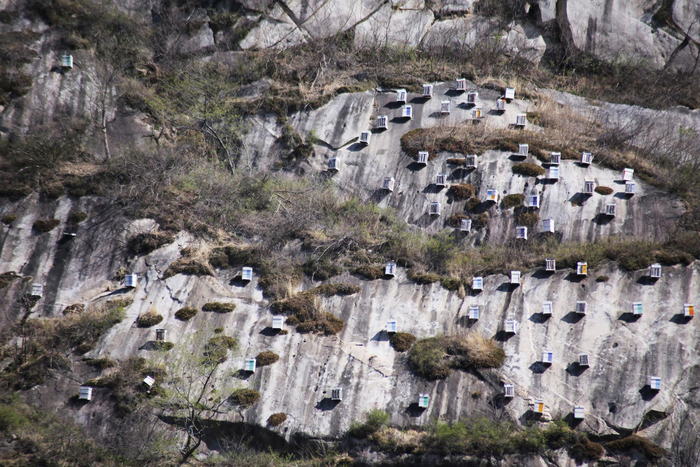 在冯家峪镇西口外村百余米高的悬崖峭壁上,挂放着600个小木箱,这里是华北最大的崖壁式景观蜂场,木箱中“居住着”濒危中华蜂。