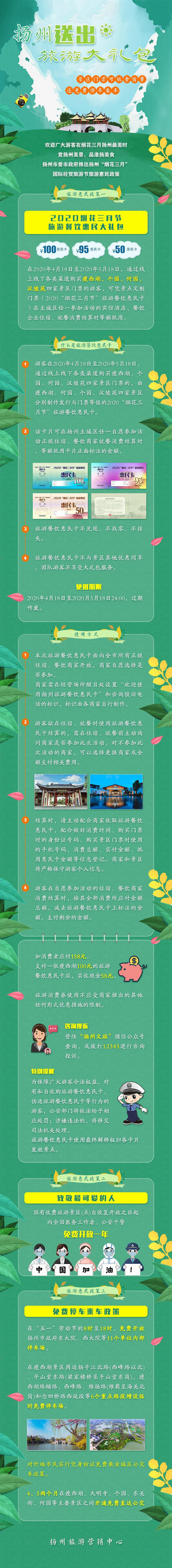 据悉,2020“烟花三月”节旅游餐饮惠民“大礼包”具体政策为:在4月18日至5月18日期间,面向游客发放2020“烟花三月节”旅游餐饮惠民卡。游客在2020年4月18日至2020年5月18日24时,通过线上线下各类渠道购买瘦西湖、个园、何园、汉陵苑四家景区门票,可领取瘦西湖、个园、何园、汉陵苑四家景区分别制作发行与门票等值的2020“烟花三月节”旅游餐饮惠民卡(以下简称“旅游餐饮惠民卡”)。游客持旅游餐饮惠民卡在扬州主城区任一参加活动的正规住宿、餐饮商家住宿、就餐消费结算时,可等额抵用卡片正面标注的金额。旅游餐饮惠民卡不兑现、不找零、不挂失。旅游餐饮惠民卡不与景区其他优惠同享,团队游客不享受大礼包政策。