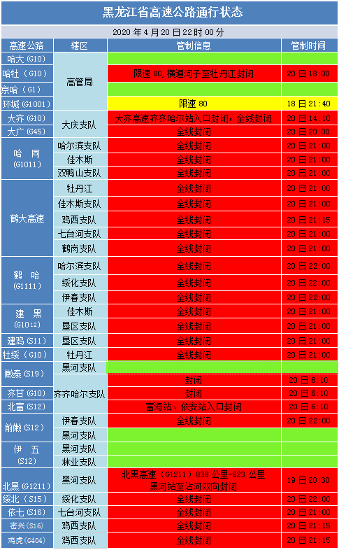 据黑龙江省公安厅高速公路交通管理局消息,受降雪影响,黑龙江哈牡高速部分封闭,哈同、鹤大、鹤哈等高速全线封闭。