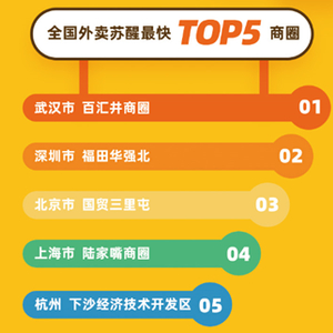 在一线城市,餐饮商家快速恢复经营,外卖订单量遥遥领先,深圳、广州、北京、上海、杭州成为外卖点单量前五大城市。而外卖单量增长排名前五的全国热门商圈,分别为武汉百汇井、深圳福田华强北、北京国贸三里屯、上海陆家嘴、杭州下沙经济技术开发区。