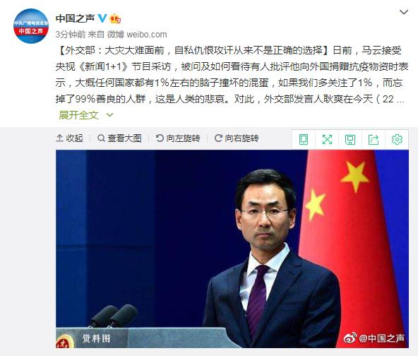 日前,马云接受央视《新闻1+1》节目采访,被问及如何看待有人批评他向外国捐赠抗疫物资时表示,大概任何国家都有1%左右的脑子撞坏的混蛋,如果我们多关注了1%,而忘掉了99%善良的人群,这是人类的悲哀。对此,外交部发言人耿爽在今天(22日)的例行记者会上回应表示,马云先生的话很直接,也很坦率。作为外交部发言人,我想说的是,在大灾大难面前,自私、仇恨、攻讦从来不是正确的选择。良知、互助、感恩才是强大的力量。