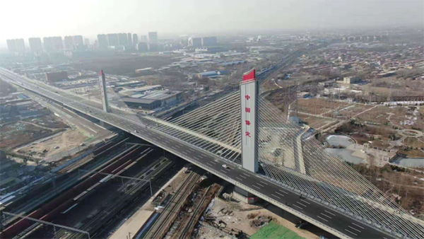 中铁十八局集团五公司承建的打破三项世界纪录的保定乐凯大街南延工程跨京广铁路转体斜拉桥。