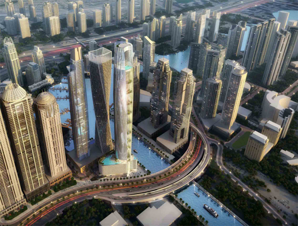 中铁十八局集团承建的全球最高酒店类建筑——总高度368.6米的迪拜蓝天酒店项目效果图。
