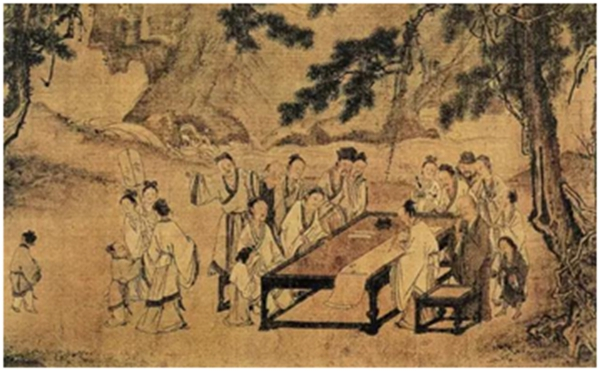 《西园雅集图》局部(南宋 马远),描绘了众多文人雅士在驸马都尉王诜府中作客聚会的情景。