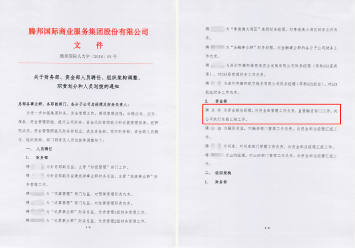 腾邦国际关于财务部、资金部人员聘任、组织架构调整、职责划分和人员划拨的通知,其中写明“聘史玲为资金部总经理”。图/受访者提供