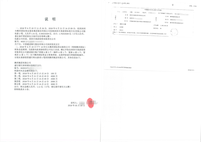 该说明书及下图付款凭证显示,在2018年6月19日,腾邦国际财务总监顾勇取走喜游投资网银U盾,交于腾邦国际资金主管黄泽妙。喜游投资分别于2018年6月20日和6月21日收到腾邦国际合计约1.7亿元的收购款,黄泽妙分别于6月20日和6月21日合计从喜游投资银行账户转出1.11亿元至腾邦集团有限公司。 图/受访者提供