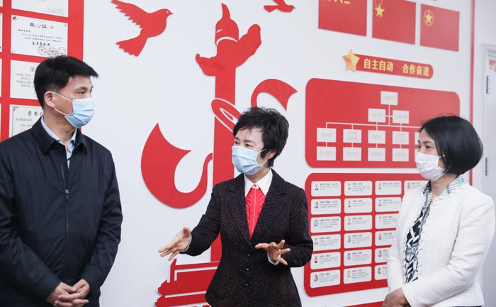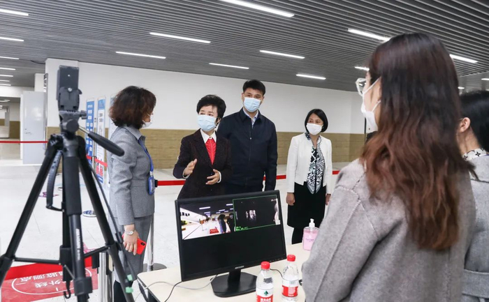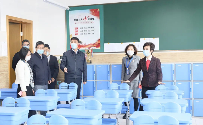会前,区校领导在二附校瞿丽红书记和李鸿娟校长的陪同下,察看二附校新校园建设情况,详细了解学校开学准备和复学防疫工作情况。在留观室、防疫物资储备室、校园文化廊、操场、初三教室、初三教师办公室、食堂等防疫重点区域和教学活动场所,区校领导详细询问了应急反应程序、防疫物资储备、师生就餐流程等情况,并亲切慰问坚守岗位的教职工。