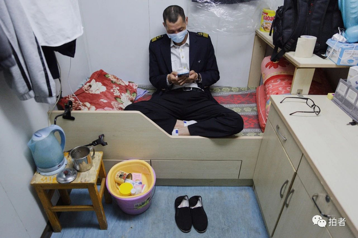 △ 4月22日,“江城1号”,完成当天航行任务后,饶伟在船员休息室休息,准备睡觉。轮值期间,船长需要在船上过夜。