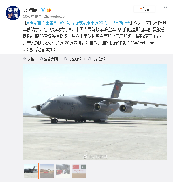 今天,应巴基斯坦军队请求,经中央军委批准,中国人民解放军派空军飞机向巴基斯坦军队紧急援助防护服等疫情防控物资,并派出军队抗疫专家组赴巴基斯坦开展防疫工作。抗疫专家组此次乘坐的运-20运输机,为首次赴国外执行非战争军事行动。看图↓(总台记者崔如)