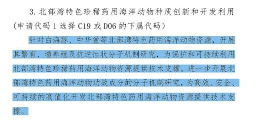 此前将把中华白海豚列为珍稀药用海洋动物,为年度项目指南中,第二部分“环境与生态领域”中第五条围绕北部湾海洋资源开发的第三小条中的表述。