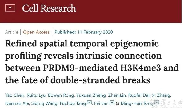 近日,复旦大学生物医学研究院研究员、复旦大学附属中山医院兼职教授蓝斐课题组与中科院分子细胞卓越创新中心(上海生物化学与细胞生物学研究所)研究员童明汉课题组、北京大学研究员汤富酬课题组合作在《细胞研究》(Cell Research)上发表论文。与之前PRDM9决定DSB热点研究不同,该文提出PRDM9及其介导的H3K4me3协同局部染色质环境可能参与了DSB修复过程,与同源重组命运决定相关;发现早期生成的DSBs更倾向于修复形成交叉。本文不仅为同源重组命运决定和交叉稳态的调控研究提供了新视角,也证实了遗传物质交换机制和表观遗传调控的相关性。