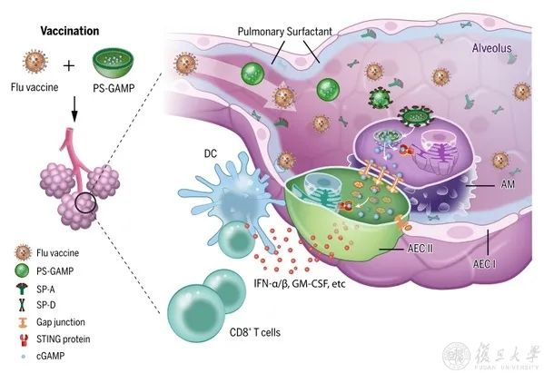 2020年2月21日,复旦大学基础医学院陆路、姜世勃团队联合哈佛医学院麻省总医院Mei X Wu副教授合作研究成果以Research Article的形式登上《科学》(Science)杂志主刊。论文题为《肺泡活性物质仿生纳米颗粒(PS-GAMP)增强抵御异型流感病毒感染》,揭示了仿生纳米颗粒作为通用流感疫苗粘膜佐剂的作用和机制。