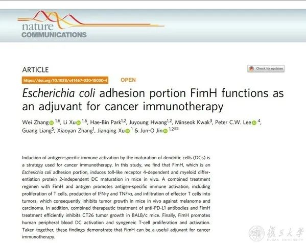 近日,复旦大学生物医学研究院教授张晓燕和上海市(复旦大学附属)公共卫生临床中心兼职教授Jun-O Jin团队在小鼠体内和人外周血细胞中共同揭示大肠杆菌粘附素FimH在癌症免疫治疗中的佐剂效应,为癌症免疫治疗佐剂提供新的候选。相关研究在线发表于《自然-通讯》(Nature Communications)。