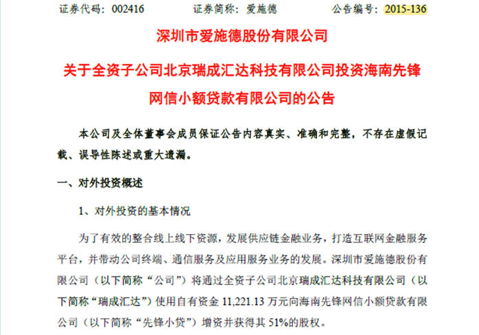 在爱施德2019年9月29日发布的《关于全资子公司北京瑞成汇达科技有限公司转让海南先锋网信小额贷款有限公司股权的公告》(下称“2019-069号公告”)中,记者看到这次转让的细节。据其披露,爱施德在2015年11月16日召开的第三届董事会第三十二次(临时)会议上,同意瑞成汇达使用自有资金1.12亿元向海南小贷增资,并获得其51%的股权,将海南小贷注册资本增加至2.04亿元。