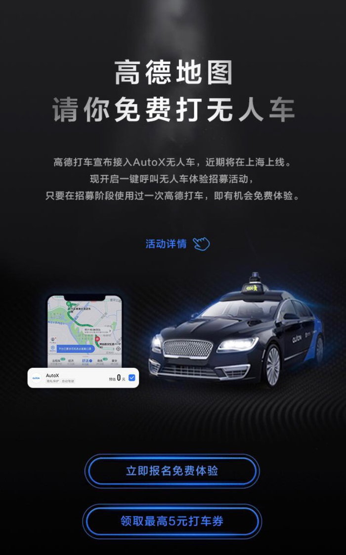 据多家媒体报道,高德打车昨日宣布接入AutoX无人车,并在上海联合启动体验招募活动。即日起,上海市民可按呼叫普通网约车的操作呼叫无人车,在指定许可自动驾驶范围内免费体验。体验期结束后,该项目近期将正式上线,对公众开放。