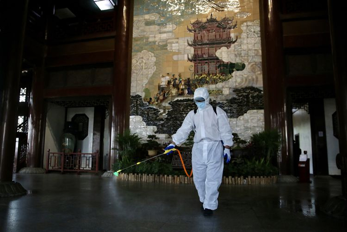 新京报讯 4月28日,武汉黄鹤楼公园,身穿防护服的工作人员正在园区内进行喷洒式消杀。各出入口与主楼均设置了隔离栏、排队隔离线与健康码扫码标识。