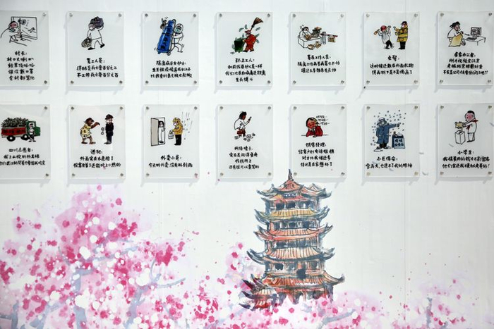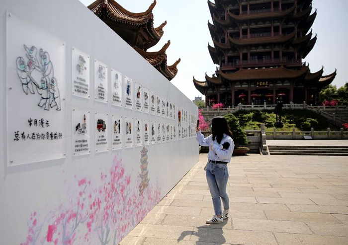 黄鹤楼主楼旁,小林漫画《武汉一定赢》画展布置完毕。